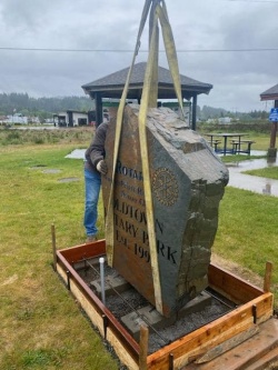 Installing the Rotary Rock display outside the Oldtown Rotary Park Building